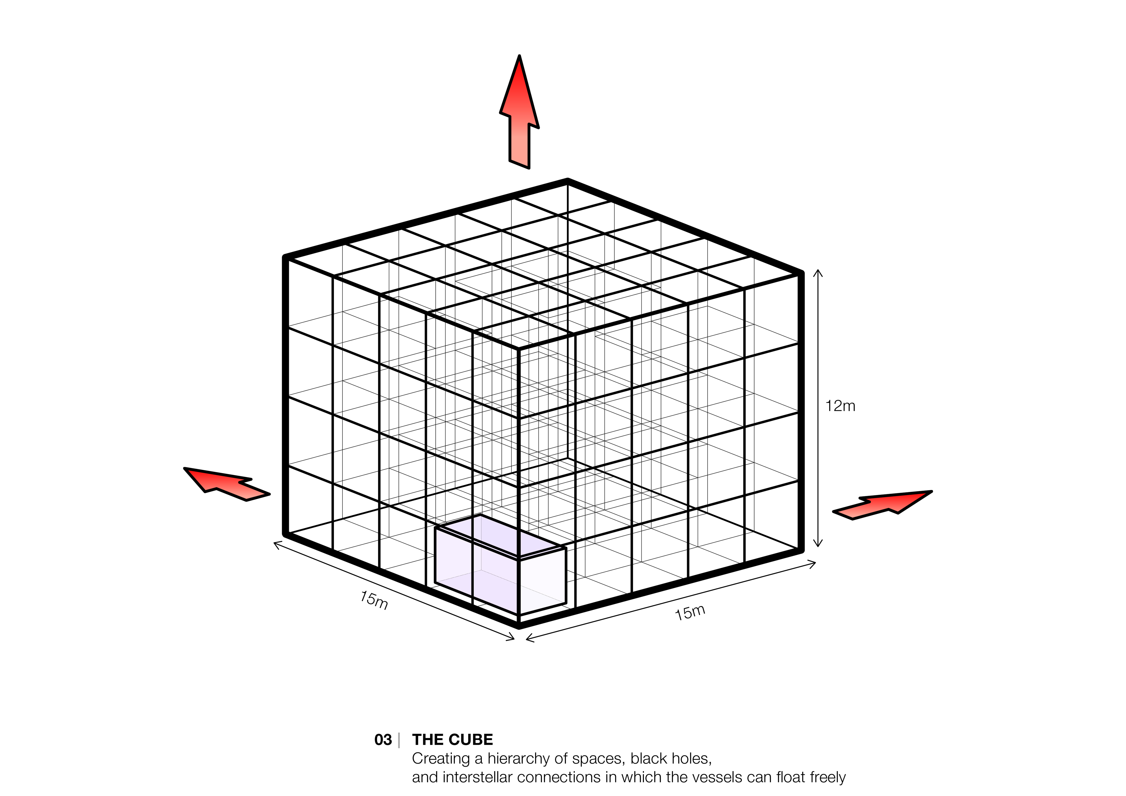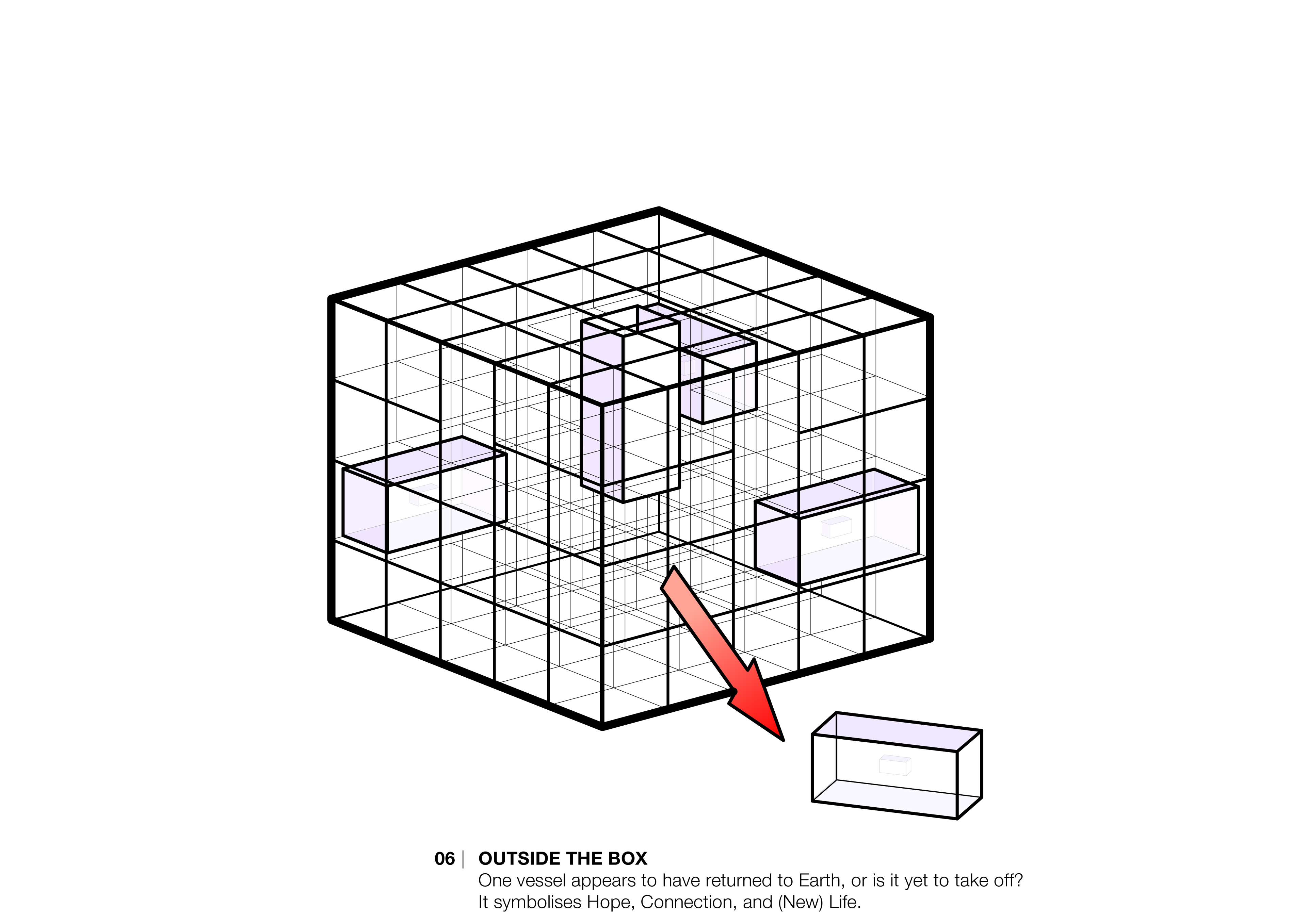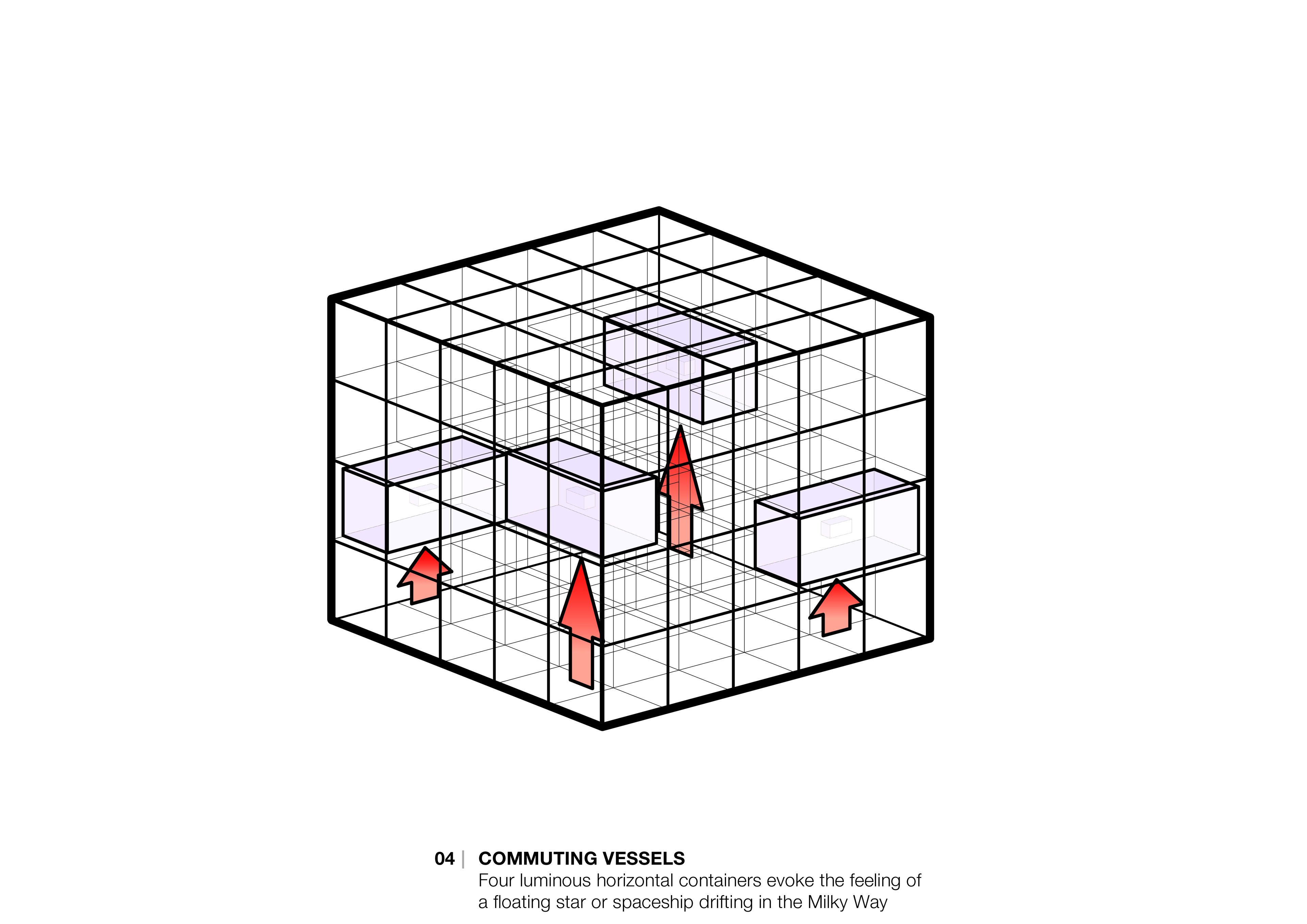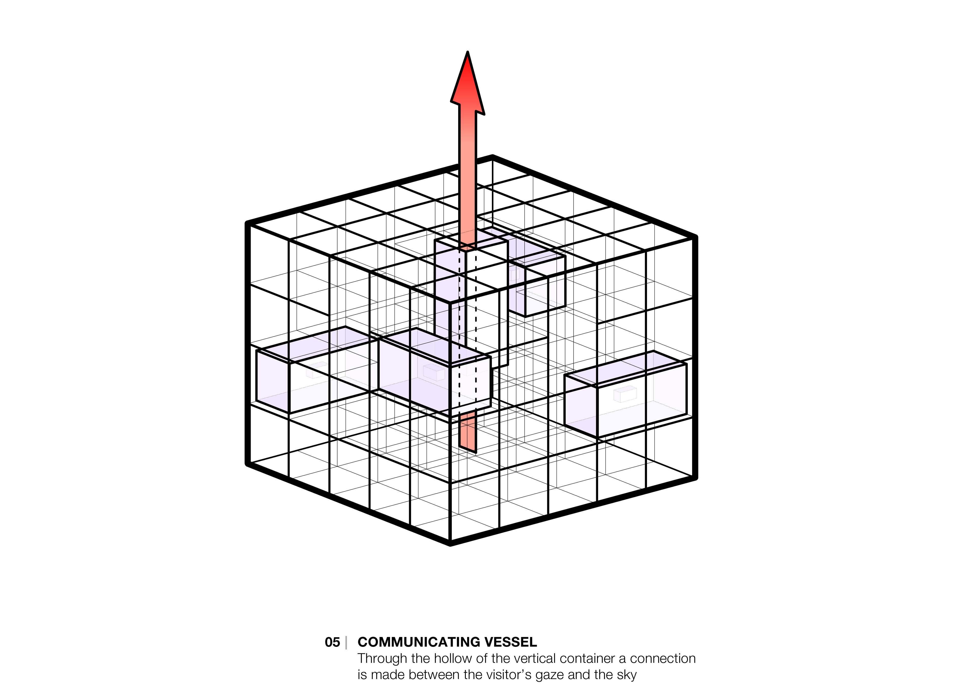 通过透空的垂直箱体,游客与天空彼此之间产生 连结。 透空垂直箱体的内部在白天仿佛万花筒般,呈现出天空的无限 反思。 它探索了箱体和星辰间共同的主题,它们也是传递实体和理念的船只。